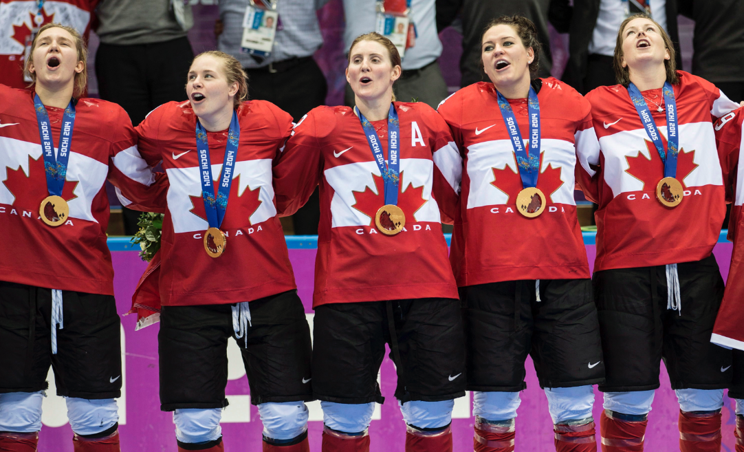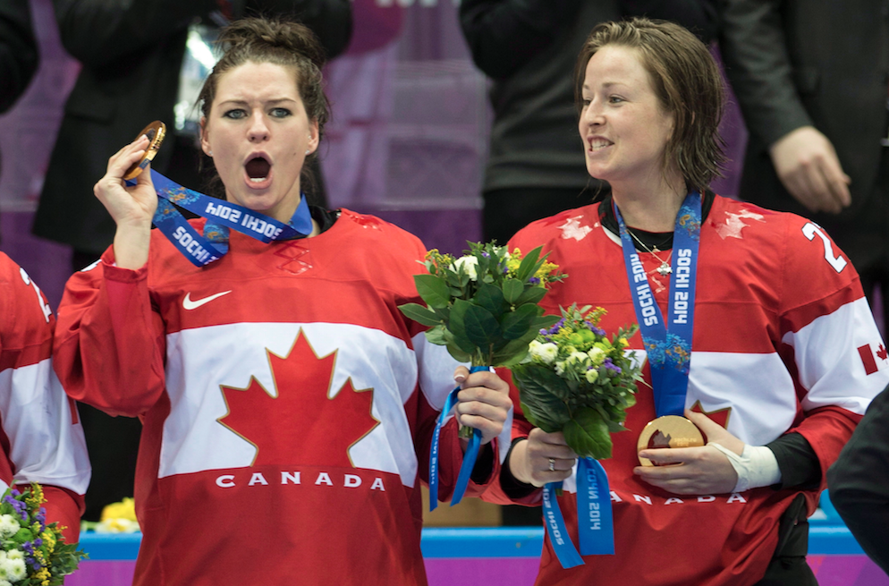 Marie-Philip Poulin (center) celebrates with teammates after winning women’s hockey gold for Canada. (Photo: Steve Boudreau)