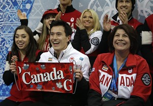 Patrick Chan of Canada, centre, and his team members wait for his results after he competed in the men’s team short program figure skating competition at the Iceberg Skating Palace during the 2014 Winter Olympics, Thursday, Feb. 6, 2014, in Sochi, Russia. (AP Photo/Darron Cummings, Pool)