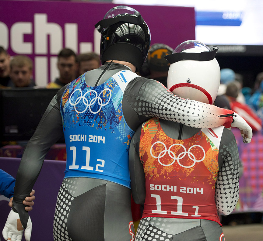 Canada’s Samuel Edney (left) places his arm around teammate Alex Gough following their teams fourth place finish in the Luge Team Relay at the Sochi Winter Olympics in Krasnaya Polyana, Russia, Thursday, Feb. 13, 2014. THE CANADIAN PRESS/Jonathan Hayward