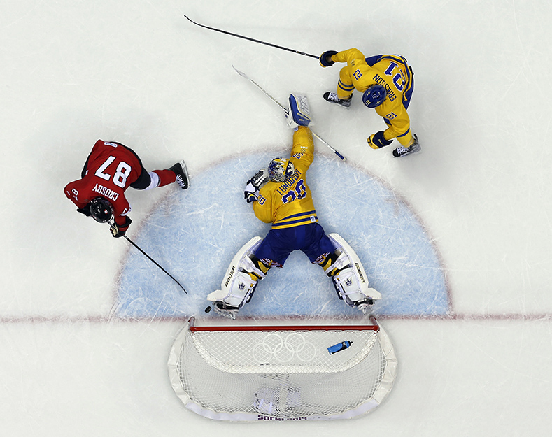 Canada forward Sidney Crosby scores a goal on Sweden goaltender Henrik Lundqvist during the second period of the men’s gold medal ice hockey game at the 2014 Winter Olympics, Sunday, Feb. 23, 2014, in Sochi, Russia. (AP Photo/David J. Phillip )
