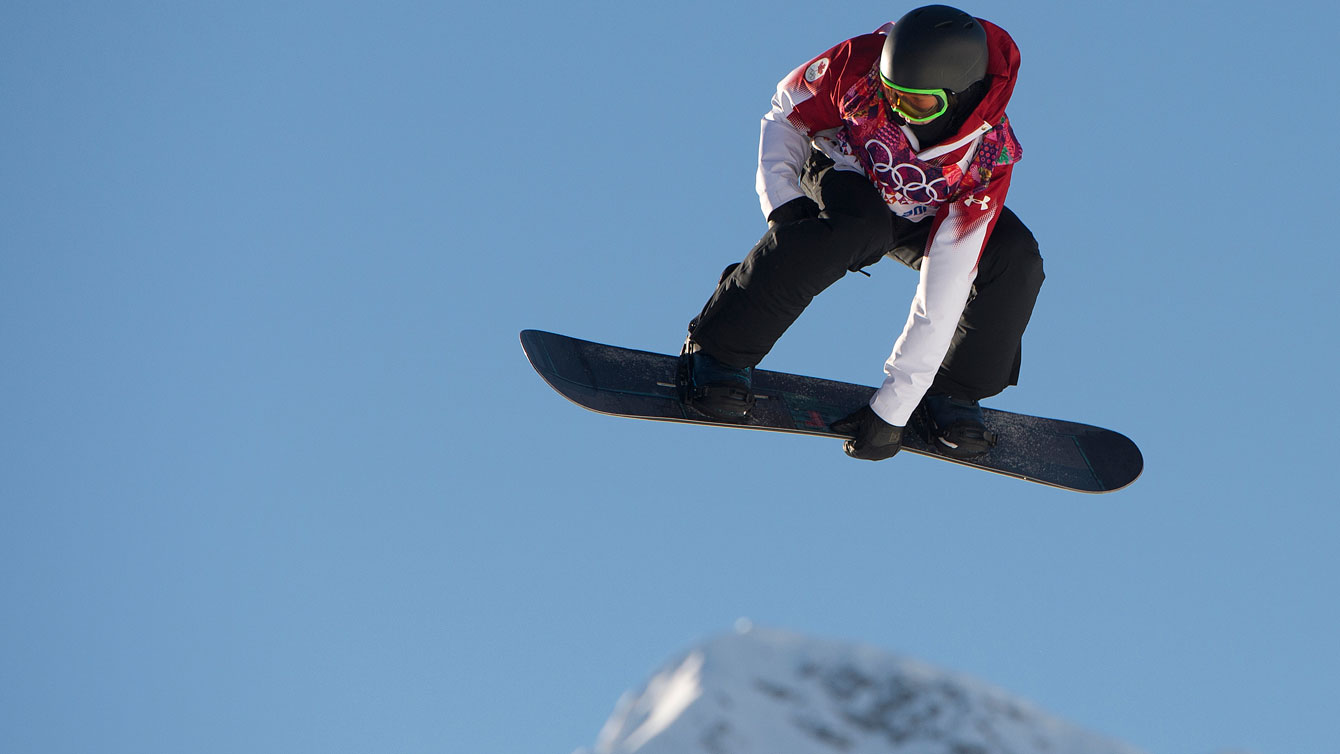 Mike Riddle in action at the ski halfpipe competition at Sochi 2014