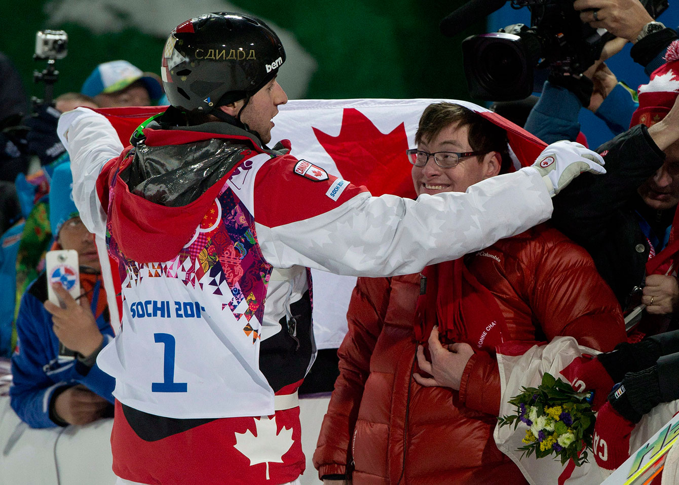 Canada’s Justine Dufour-Lapointe, right, is congratulated by her sister, Chloe, after taking first place in the women’s moguls final at the 2014 Winter Olympics, Saturday, Feb. 8, 2014, in Krasnaya Polyana, Russia. Justine won the gold medal and Chloe took the silver. (AP Photo/Jae C. Hong)