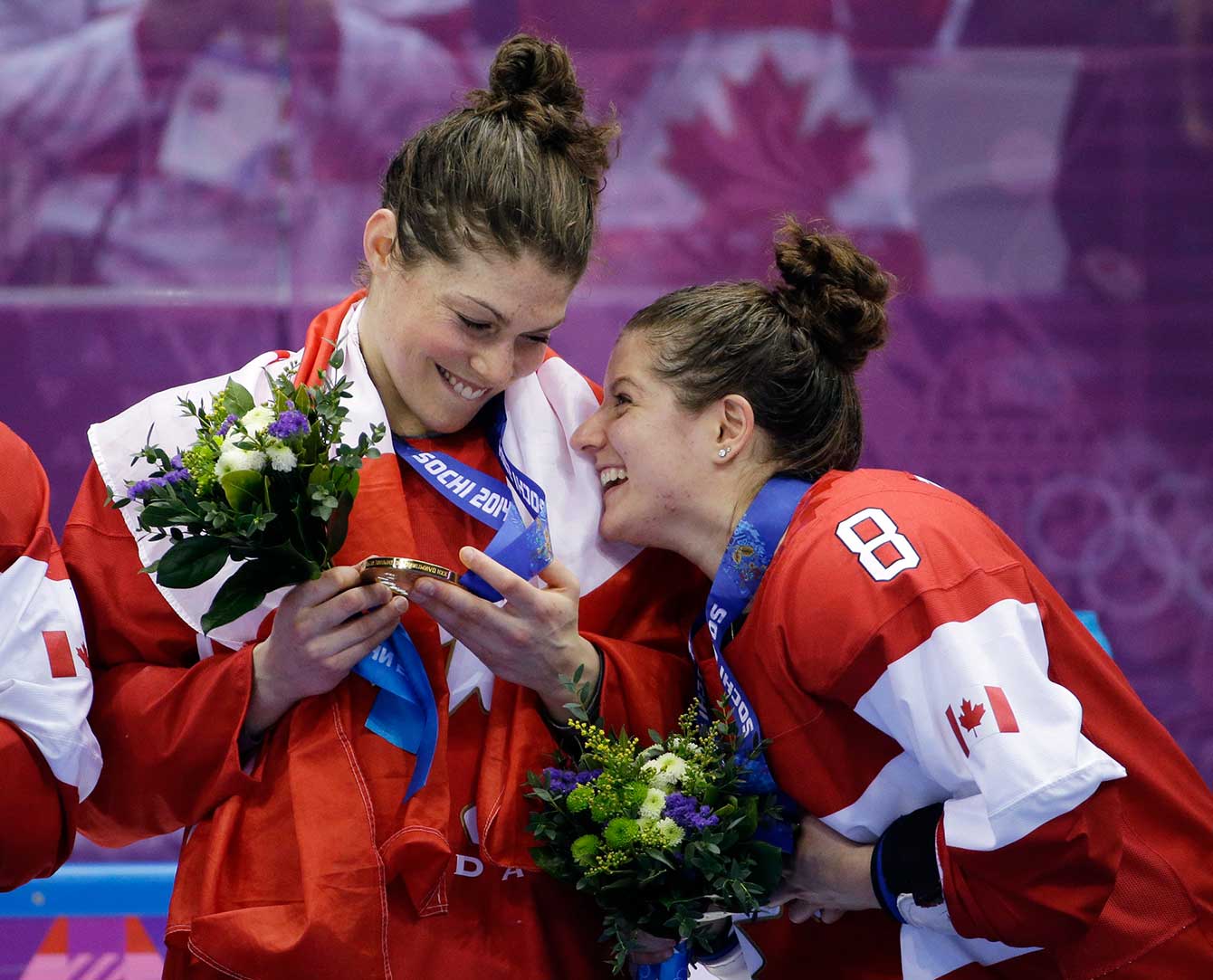 Marie-Philip Poulin of Canada (29) and Haley Irwin of Canada (21) celebrate their 3-2 overtime victory against the United States in the women’s gold medal ice hockey game at the 2014 Winter Olympics, Thursday, Feb. 20, 2014, in Sochi, Russia. (AP Photo/Julio Cortez)