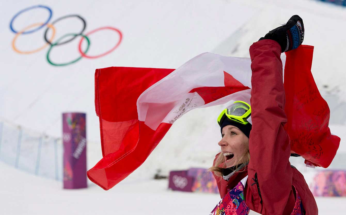 Riddle heads back to the stands draped in Canada’s flag after the flower ceremony at Rosa Khutor Extreme Park.