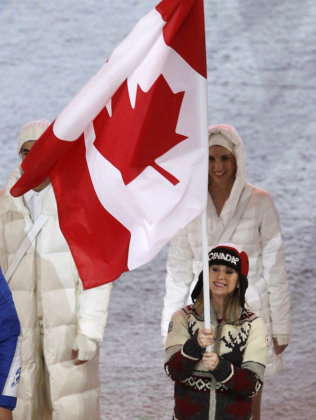 Women’s figure skating bronze medallist Joannie Rochette carries the Canadian flag into the Vancouver 2010 Olympic Winter Games closing ceremony on Sunday, Feb. 28, 2010 at B.C. Place in Vancouver. THE CANADIAN PRESS/Nathan Denette