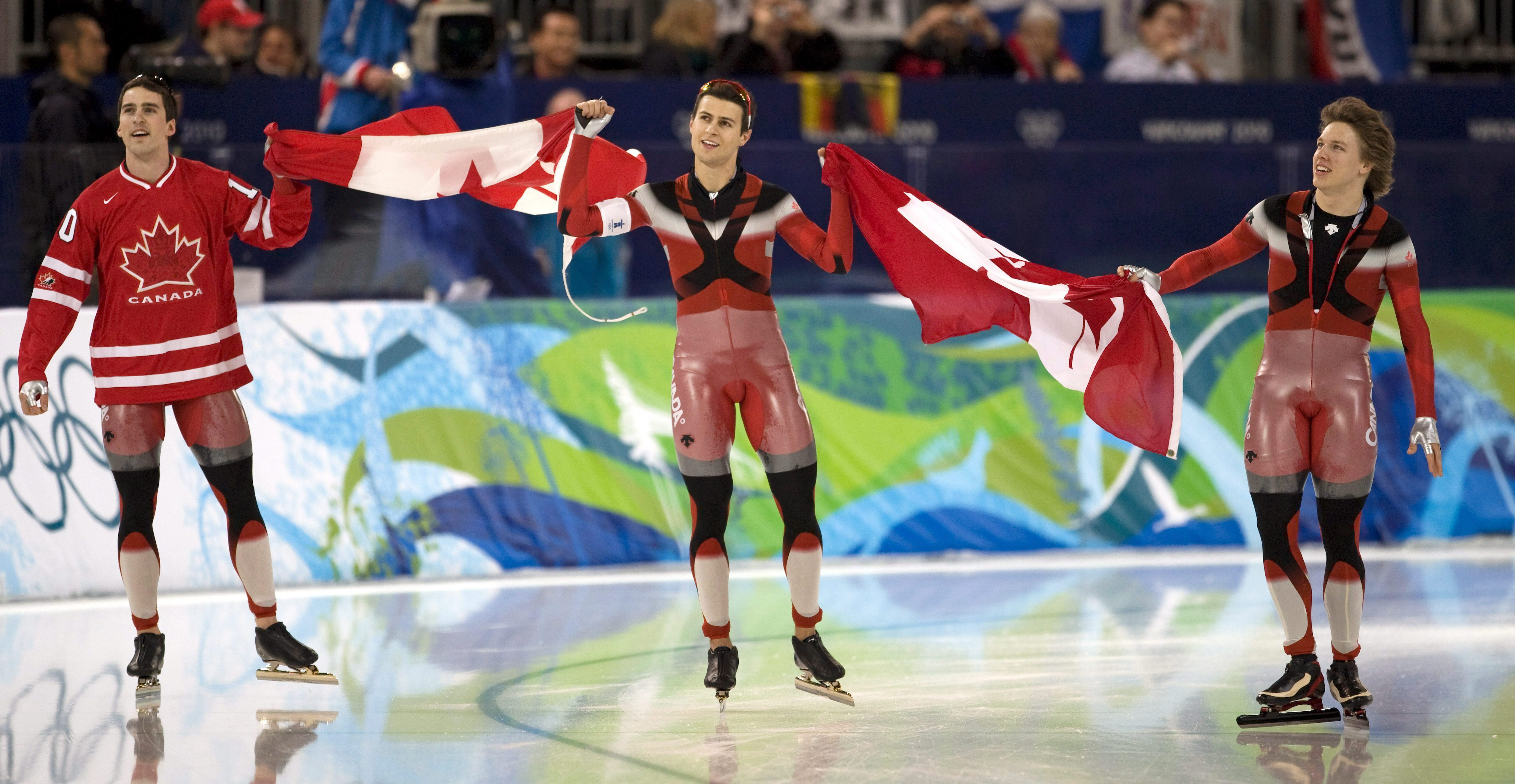 Team Canada’s Denny Morrison, left, Lucas Makowsky, center, and Mathieu Giroux, right, are seen on the podium after winning the gold medal in the men’s team pursuit final speed skating race at the Richmond Olympic Oval at the Vancouver 2010 Olympic Winter Games in Vancouver, British Columbia, Saturday, Feb. 27, 2010. (AP Photo/Matt Dunham)