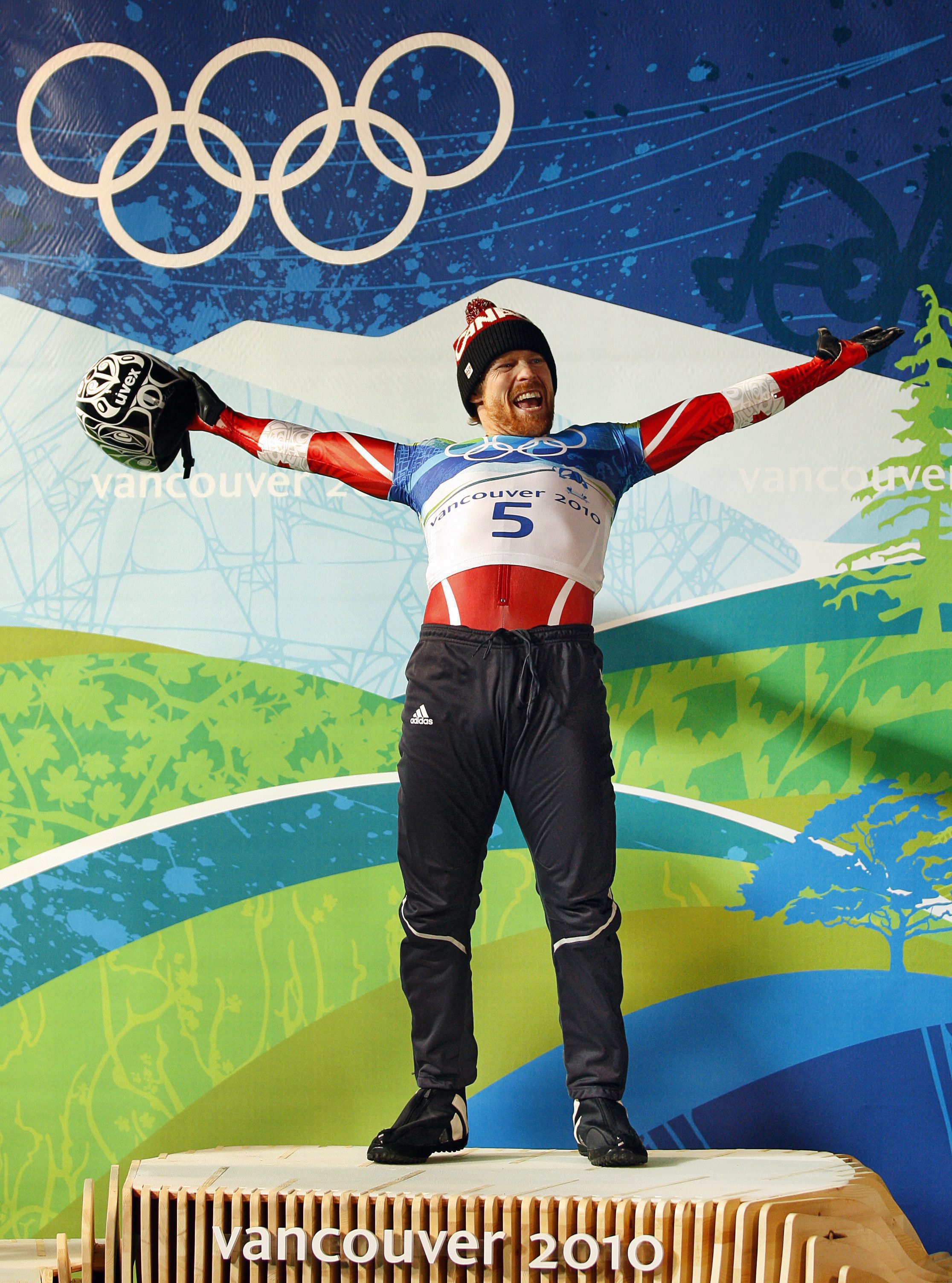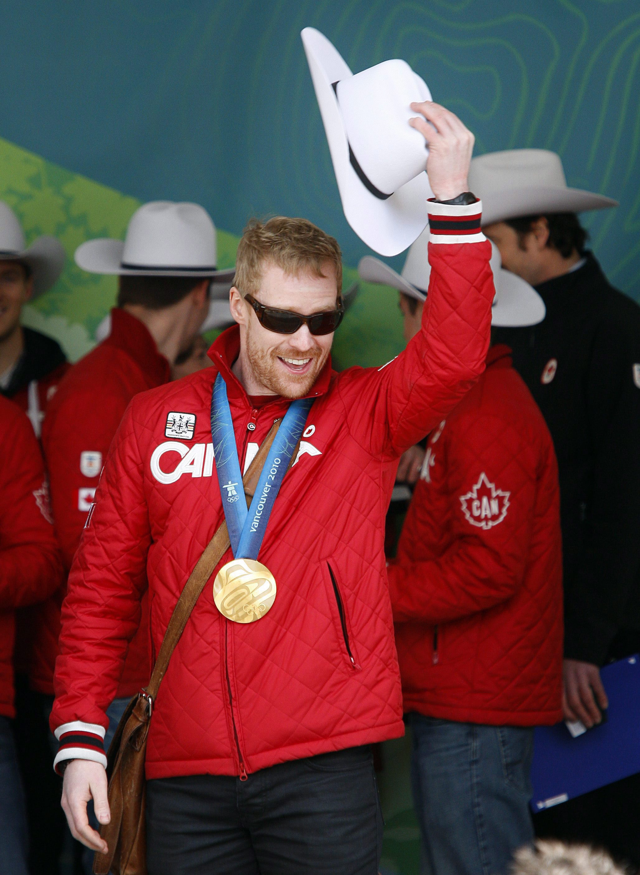 Canada’s Jon Montgomery celebrates winning a gold medal in the men’s skeleton competition at the Whistler Sliding Centre at the 2010 Vancouver Olympic Winter Games in Whistler, B.C., Friday, Feb. 19, 2010. THE CANADIAN PRESS/Jeff McIntosh