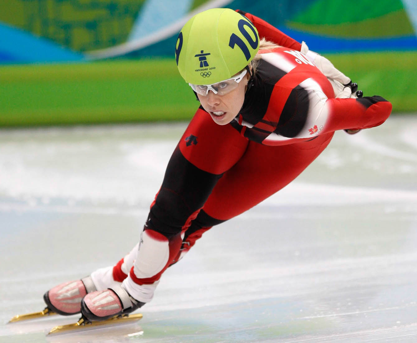 Canada’s Marianne St-Gelais reacts after winning the silver medal in the women’s 500m short track skating competition at the Vancouver 2010 Olympic Winter Games in Vancouver, British Columbia, Wednesday, Feb. 17, 2010. (AP Photo/Mark Baker)
