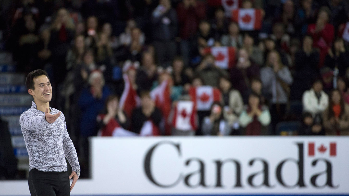 Patrick Chan acknowledges the crowd following his free skate in Lethbridge on October 31, 2015 near the conclusion of Skate Canada International.