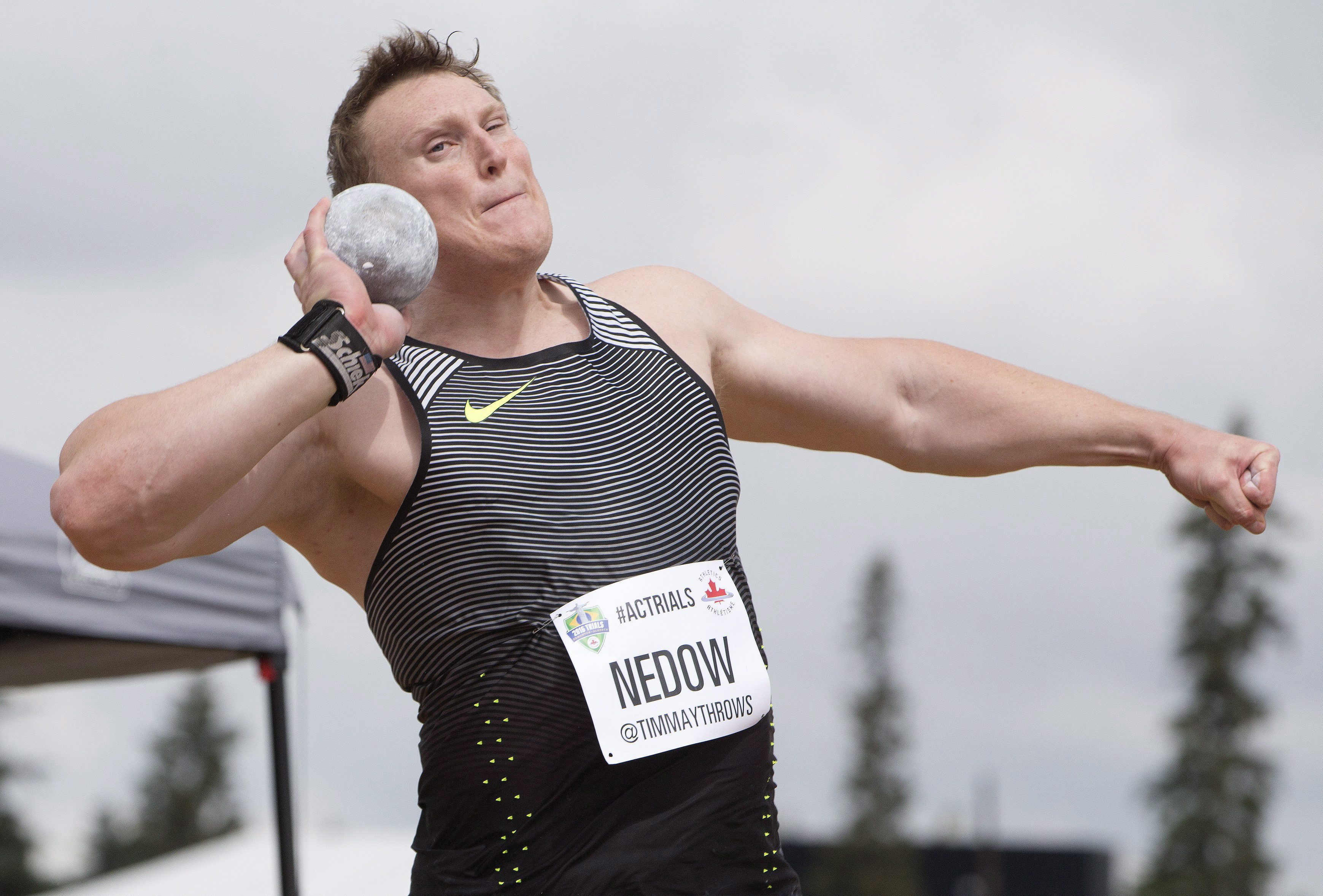 Tim Nedow makes his throw leads during the senior men’s shot put finals at the Canadian Track and Field Championships and Selection Trials for the 2016 Summer Olympic and Paralympic Games, in Edmonton, Alta., on Sunday July 10, 2016.THE CANADIAN PRESS/Jason Franson