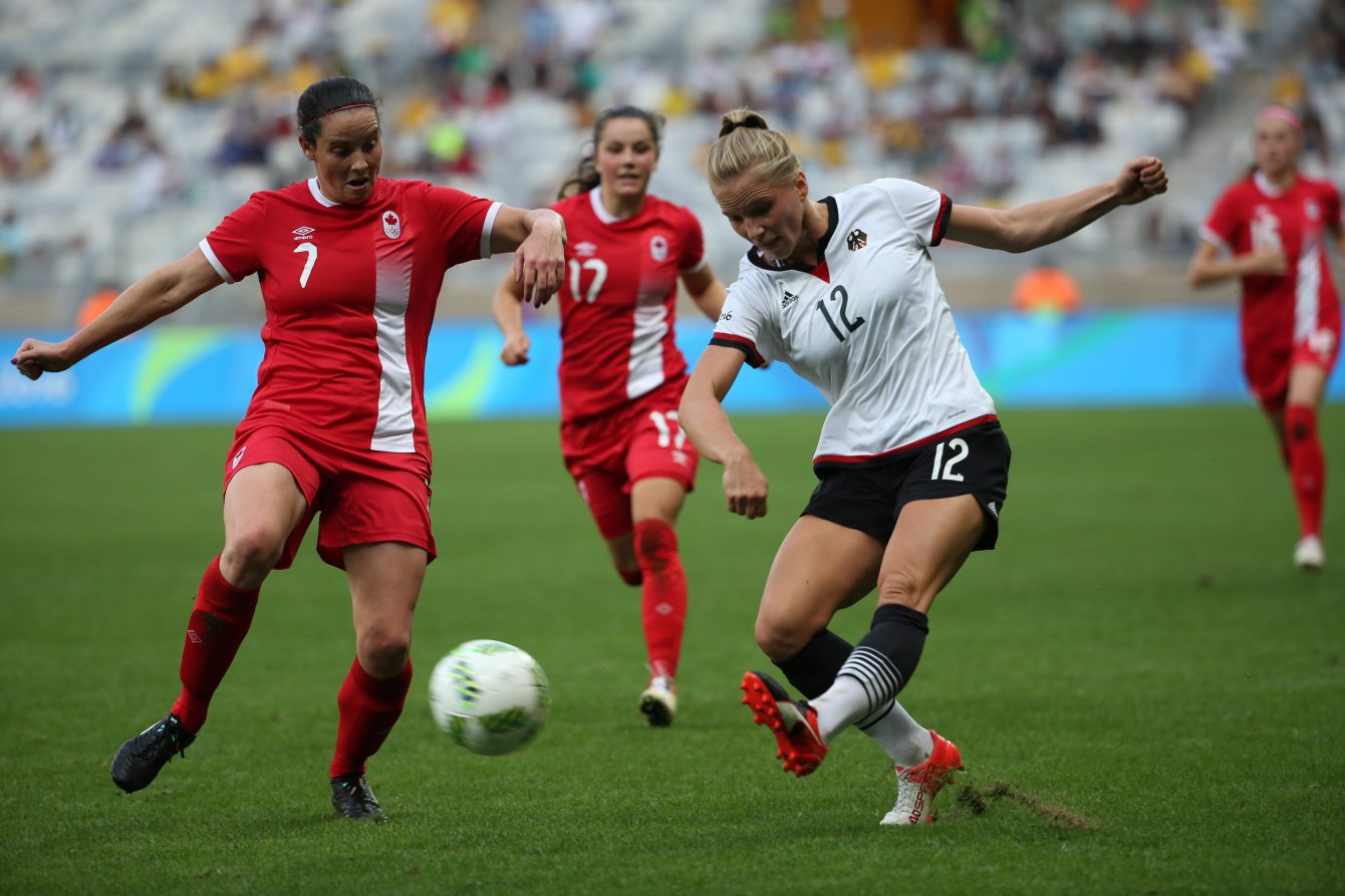 Germany’s Tabea Kemme, right, kicks the ball past Canada’s Rhian Wilkinson during a semifinal match of the women’s Olympic football tournament between Canada and Germany at the Mineirao stadium in Belo Horizonte, Brazil, Tuesday Aug. 16, 2016. (AP Photo/Eugenio Savio)