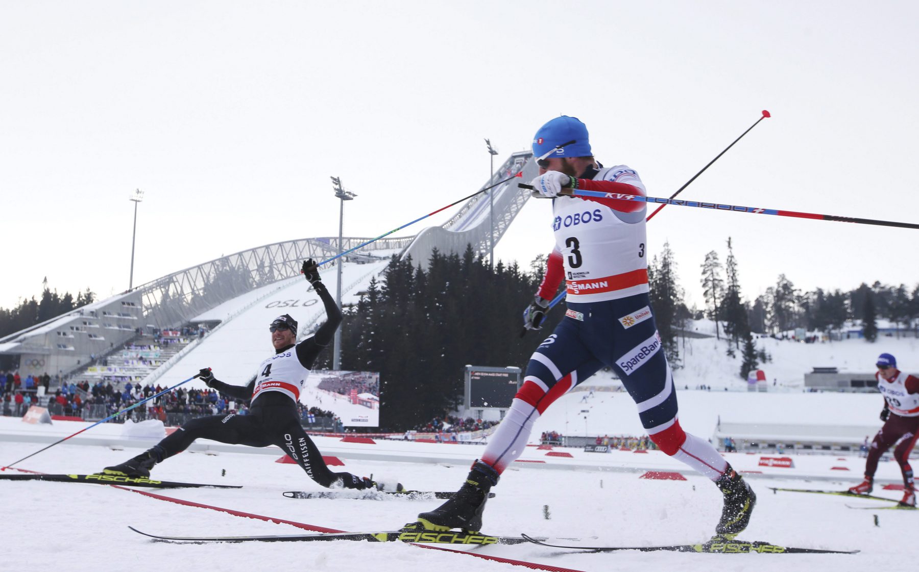 Dario Cologna of Switzerland, left, finishes first ahead of Martin Johnsrud Sundby of Norway, second, in the FIS World Cup Cross Country Men’s 50 km Mass Start in Holmenkollen, Norway Saturday, March 10, 2018. (Berit Roald/NTB scanpix via AP)