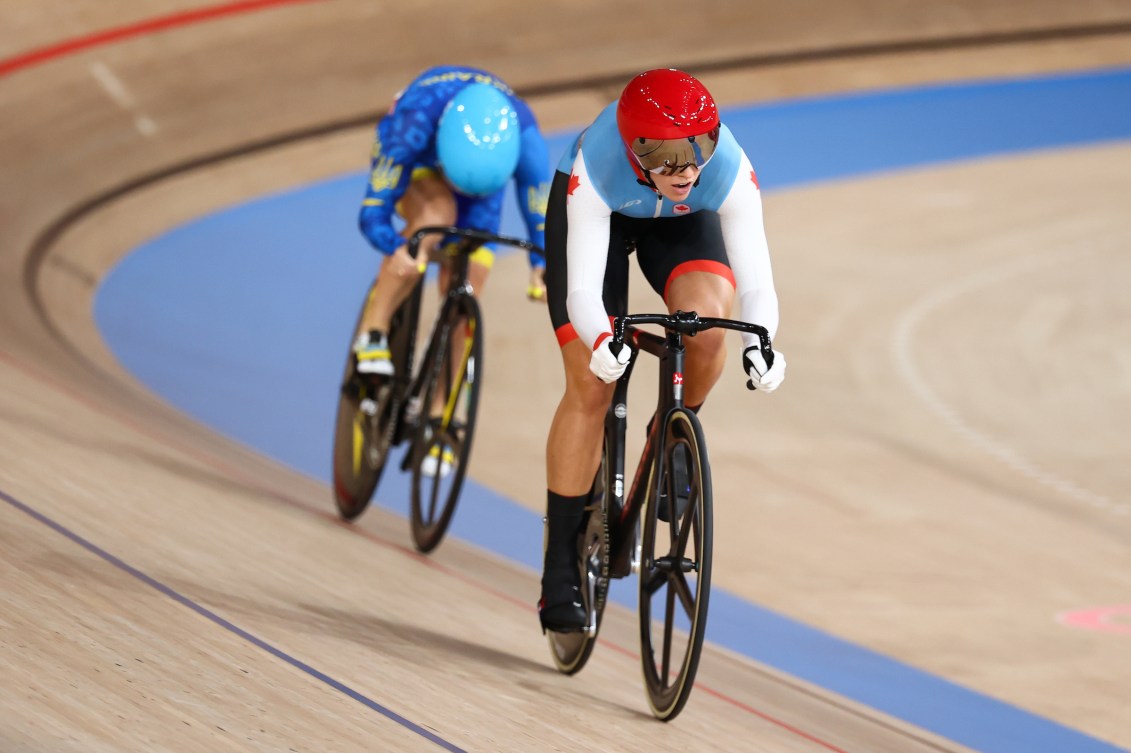 Lauriane Genest and Kelsey Mitchell didn’t have much time to celebrate their finals appearance in the keirin – and Genest’s bronze medal – as they were back on the velodrome for the women’s individual sprint. In qualifying, Mitchell was the second fastest and Genest ranked fifth, setting them up well for the 1/32 finals where they both won their heats. That advanced them to the 1/16 finals, where once again, they showed what they’re capable of, to move on to the 1/8 finals on Day 15.