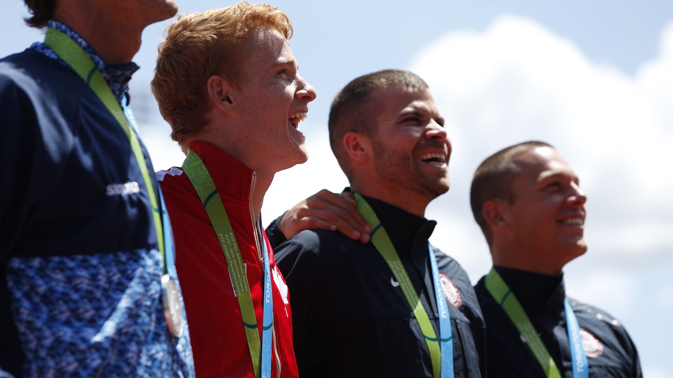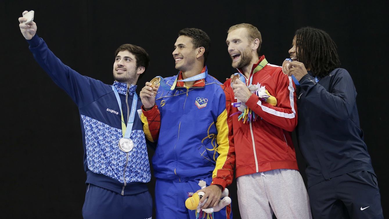 Silver medal winner, Argentina’s Jose Dominguez, left, takes a picture on the podium with medal winners from the epee fencing competition in the Pan Am Games in Toronto Tuesday, July 21, 2015. They are from left, Dominguez, Venezuela’s Ruben Limardo with his gold medal, Canada’s Hugues Boisvert-Simard with his bronze medal, and The United States’ Jason Pryor with his bronze medal.
