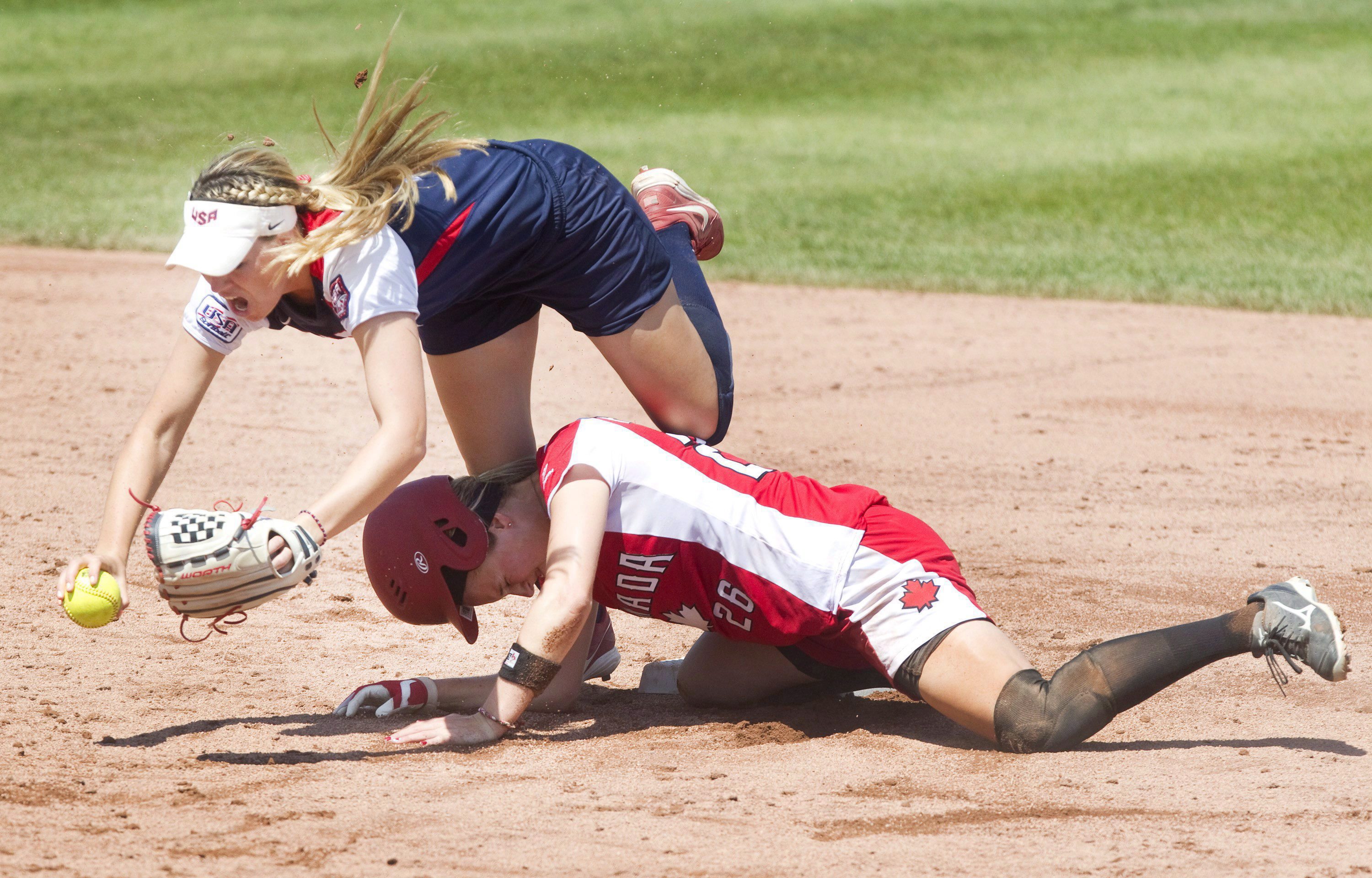 CORRECTED VERSION – CORRECTS CITY – United States shortstop Kellie Fox gets the force out at second base on Canadian Larissa Franklin during sixth inning action in women’s softball at the Pan American Games in Ajax, Ont., on Sunday, July 26, 2015. Canada beat the US in extra innings to win the gold medal. THE CANADIAN PRESS/Fred Thornhill