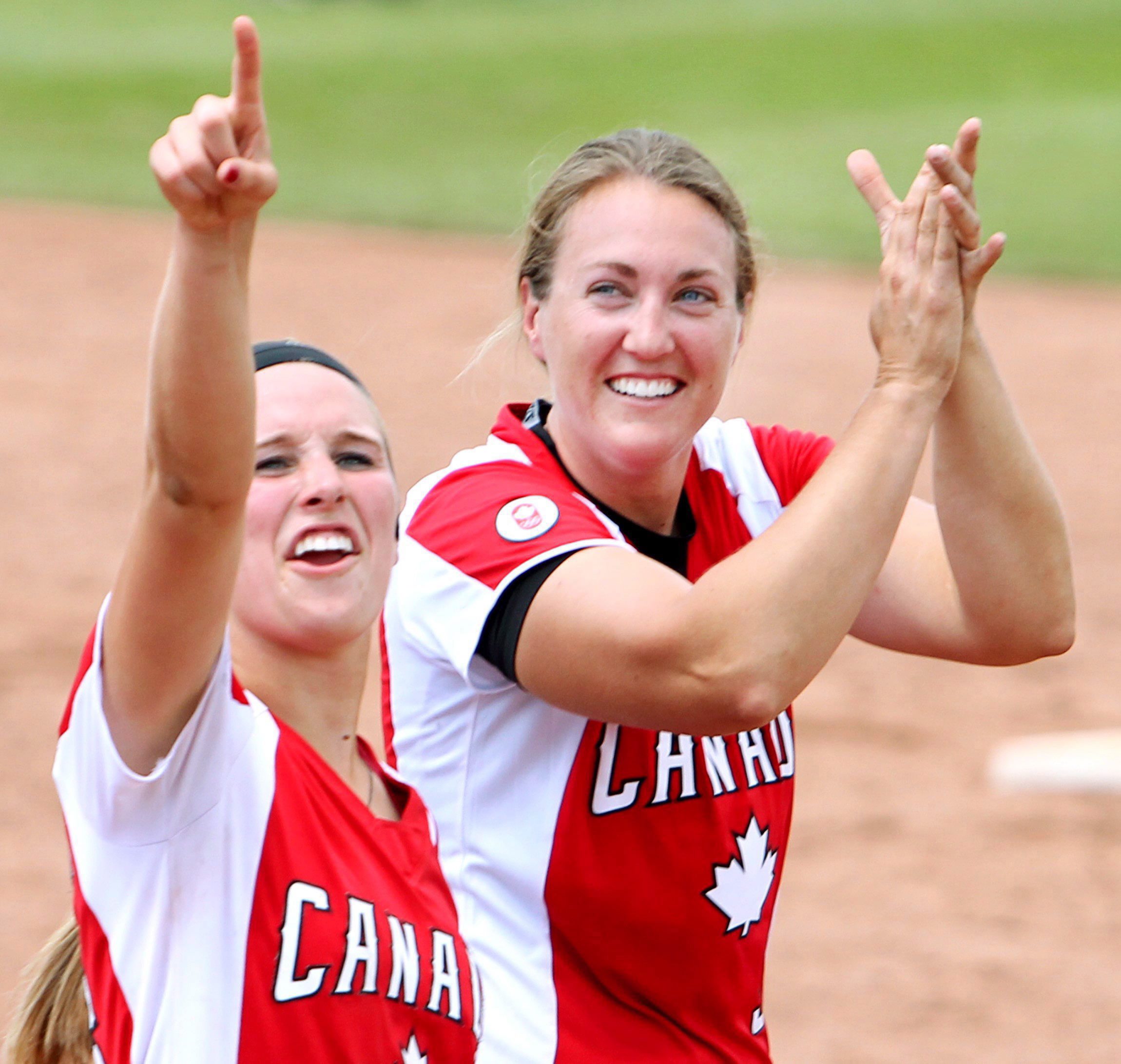 CORRECTED VERSION – CORRECTS CITY – Team Canada players Larissa Franklin and Kaleigh Rafter acknowledge the fans after beating the United States in extra innings to win the gold medal in women’s softball at the Pan American Games in Ajax, Ont., on Sunday, July 26, 2015. THE CANADIAN PRESS/Fred Thornhill