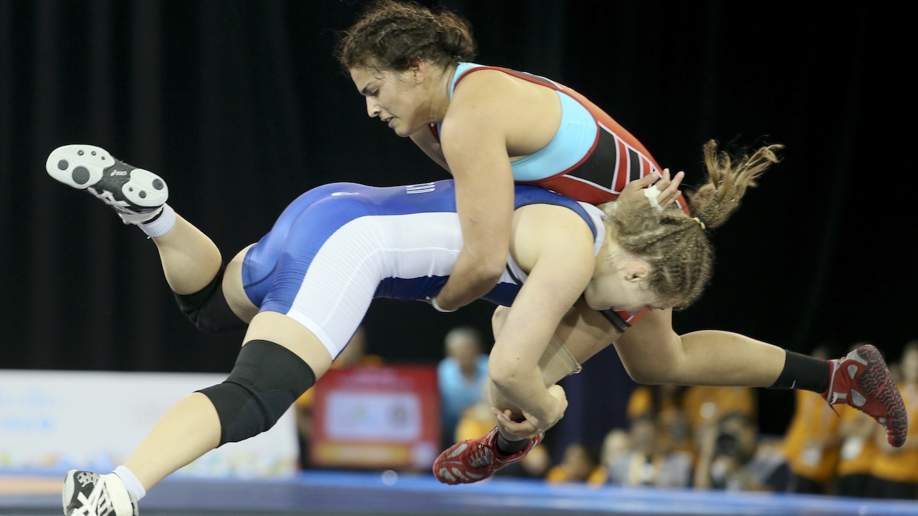 Justine Di Satsio (red) of Coquitlam, B.C. defeated Lisset Hechavarria of Cuba in the freestyle wrestling 75 kg. preliminary rounds at the PanAmerican Games in Mississauga, Ont.