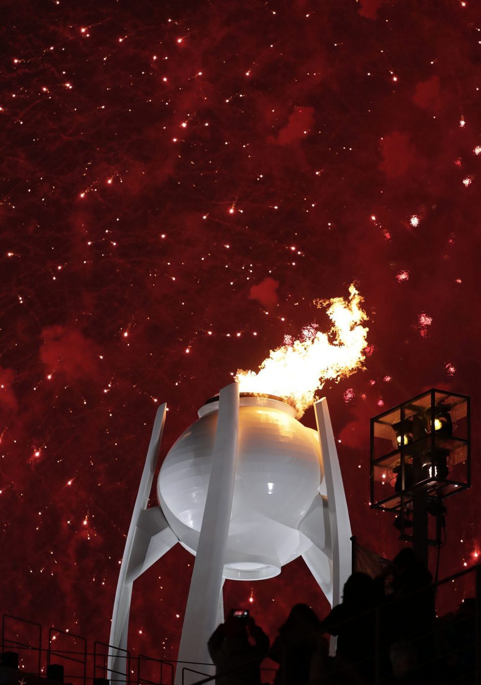 The Olympic Cauldron is lit during the Opening Ceremony of the Pyeonchang Winter Olympics in Pyeongchang, South Korea on February 9, 2018. Photo by Jason Ransom/COC