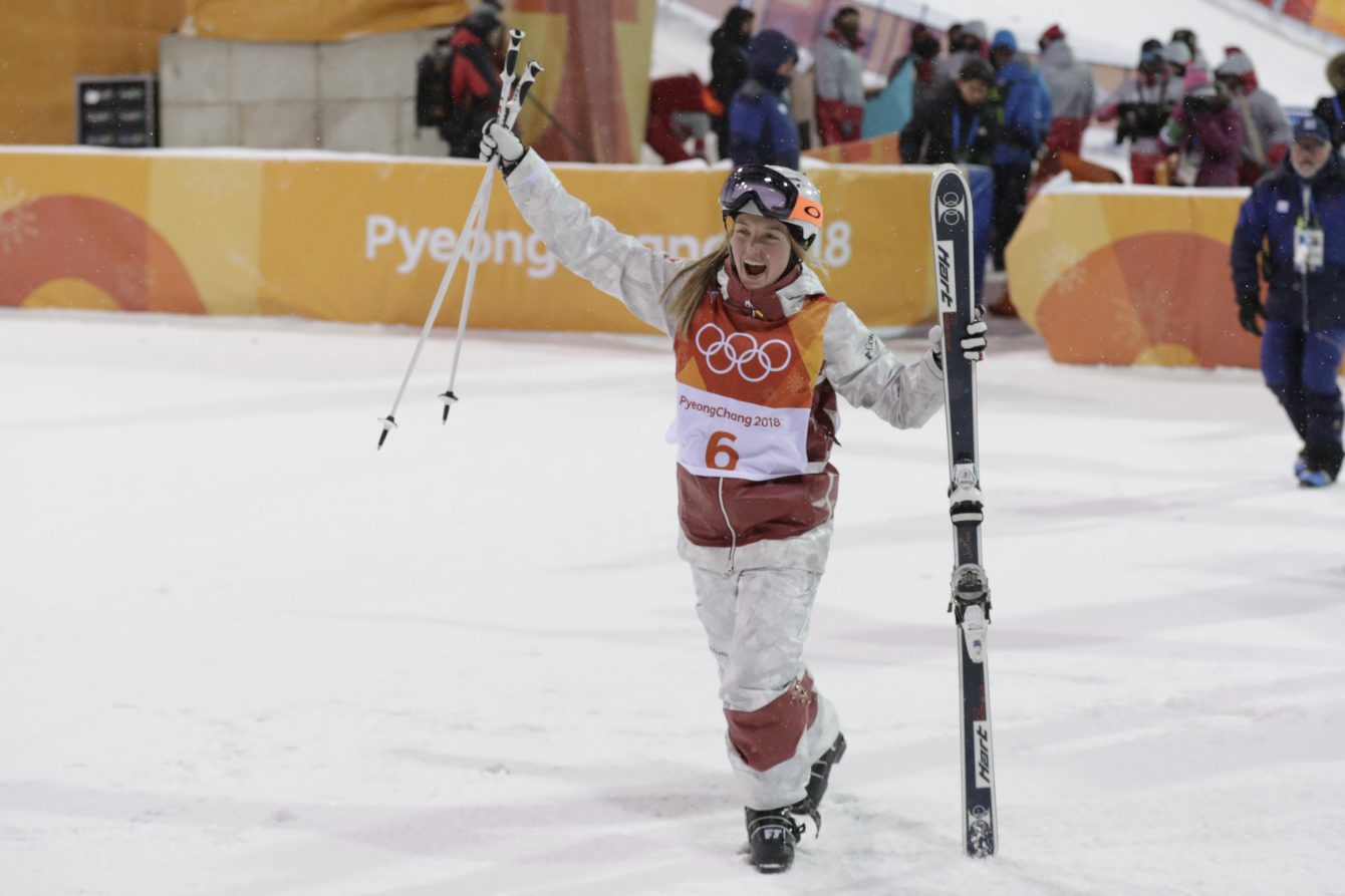 Canada’s Audrey Robichaud, of Quebec City, celebrates as she crosses the finish line after competing in the freestyle skiing event at the 2018 Winter Olympic Games, in Pyeongchang, South Korea, on Sunday, February 11, 2018. THE CANADIAN PRESS/Jonathan Hayward