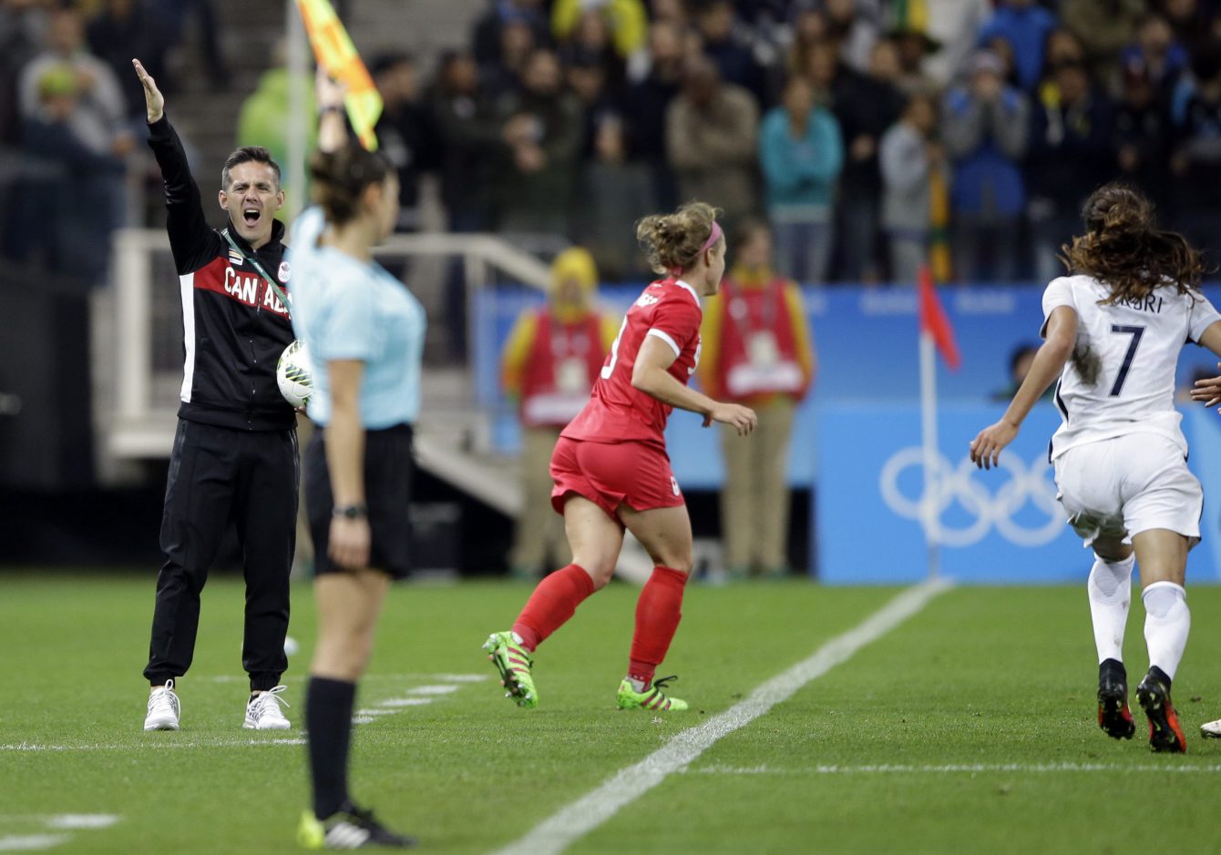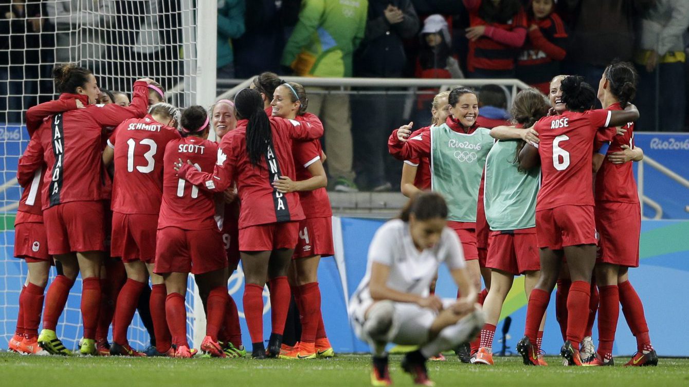 France’s Amel Majri reacts in dejection as Canada’s players celebrate after beating France in a quarter-final match of the women’s Olympic football tournament between Canada and France in Sao Paulo, Brazil, Friday Aug. 12, 2016. Canada’s won1-0 and went through to the semi-finals.(AP Photo/Nelson Antoine)