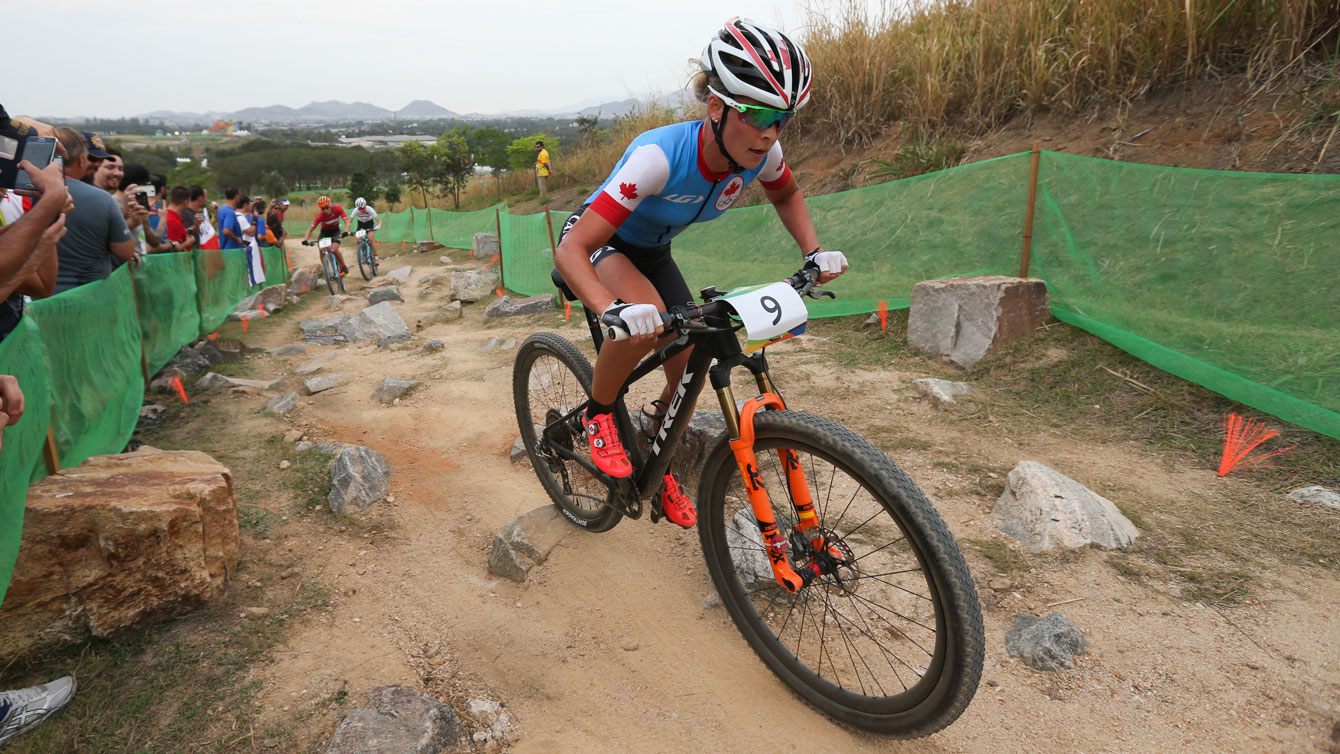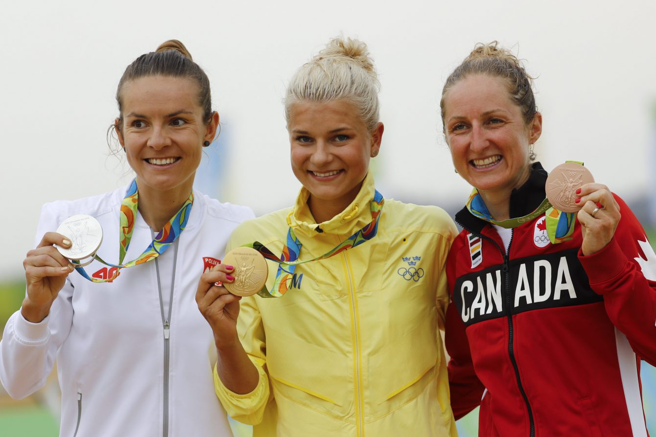 Gold medalist Jenny Rissveds of Sweden, center, silver medalist Maja Wloszczowska of Poland, left, and bronze medalist Catharine Pendrel of Canada, right, stand on the podium of the women’s cross-country mountain bike race at the 2016 Summer Olympics in Rio de Janeiro, Brazil, Saturday, Aug. 20, 2016. (AP Photo/Patrick Semansky)
