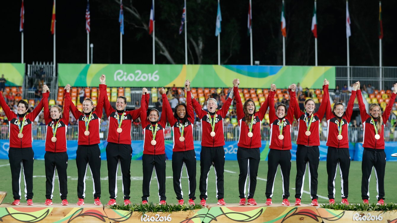 Canada’s players celebrates after winning the women’s rugby sevens bronze medal match against Great Britain at the Summer Olympics in Rio de Janeiro, Brazil, Monday, Aug. 8, 2016. (Photo/Stephen Hosier)Canada’s players celebrates after winning the women’s rugby sevens bronze medal match against Great Britain at the Summer Olympics in Rio de Janeiro, Brazil, Monday, Aug. 8, 2016. (Photo/Mark Blinch)