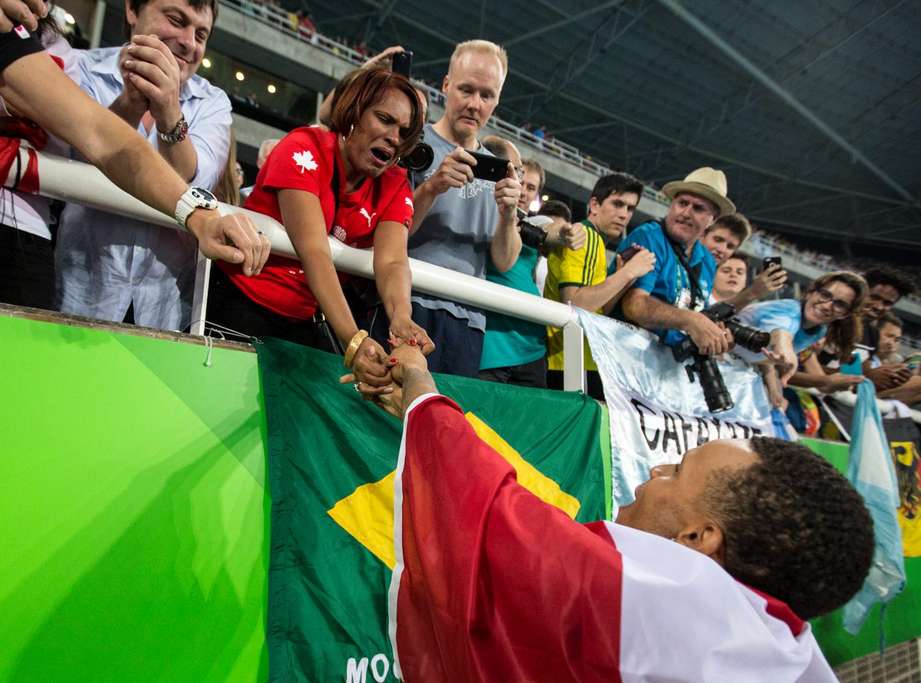 Jamaica’s Usain Bolt, right, celebrates as he wins the men’s 100-metre final ahead of third place finisher Canada’s Andre De Grasse during the athletics competition at the 2016 Summer Olympics in Rio de Janeiro, Brazil, Sunday, August 14, 2016. THE CANADIAN PRESS/Ryan Remiorz