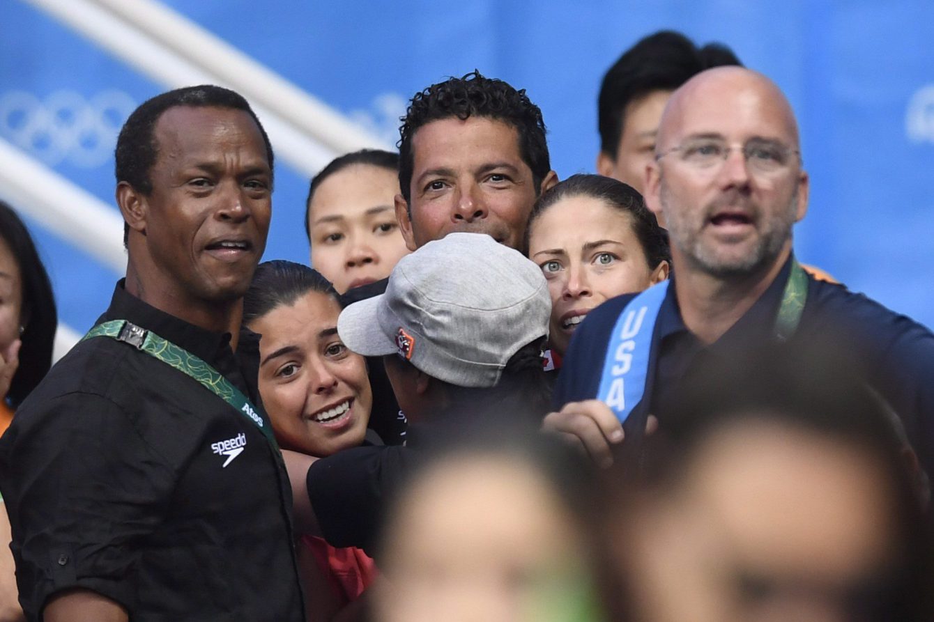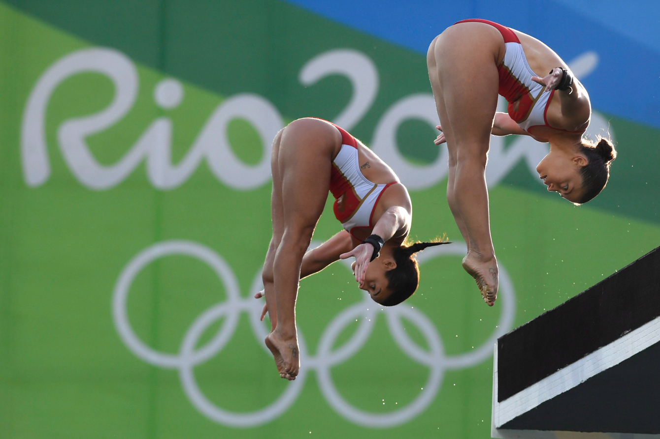Canada’s Meaghan Benfeito (centre left) and Roseline Filion (centre right) watch the results from the British team which gave them the bronze medal in the women’s synchronized 10-meter platform diving final at the 2016 Summer Olympics in Rio de Janeiro, Brazil, Tuesday, Aug. 9, 2016 THE CANADIAN PRESS/Frank Gunn